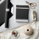 A thin white line runs through the centre of the black background. The edges of the stripe are soft, fading into the black. The stylish design has a lot of negative space.