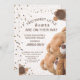 Invitation charmante pour la baby shower de vos jumeaux avec "Deux petits ours adorables sont en route" dans des couleurs crème et marron pastel présentées dans un style bohème et une écriture moderne.