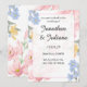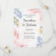Faire et charmante invitation de mariage florale présentant des fleurs pastel douces dans des nuances de rose, de bleu et de jaune. La mise en page élégante met en valeur les noms des mariés dans une police de caractères cursive gracieuse, encadrée par une bordure rose subtile. Idéale pour les mariages de printemps et d'été, cette invitation allie un style romantique à un thème de jardin frais. Entièrement personnalisable pour inclure les détails de votre événement, ce faisant, c'est un choix parfait pour une annonce de mariage élégante et intemporelle.