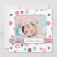 Douce carte photo d'annonce avec impression à pois et ruban rayé coordonné et garnitures de tétine bébé en 3D