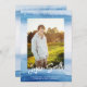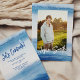 Ce faire-part de graduation photo présente un bel arrière - plan bleu aquarelle, une photo verticale sur le devant, et un script de calligraphie moderne. A l'arrière il y a un texte d'invitation pour la fête de remise des diplômes / open house. Le texte du dossier peut être supprimé si vous le souhaitez. Ce design moderne et élégant est parfait pour les diplômés amateurs de plage / surf.