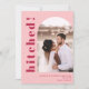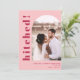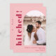 Un faire-part d'élévation mariage coloré amusant avec le titre "hitched!" en caractères magenta bold et votre photo mariage préférée en forme d'arc sur un arrière - plan rose clair. L'inverse est en magenta solide et inclut un message modifiable en maggenta en option.