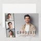 Carte à plat minimal moderne de graduation avec la photo du diplômé superposée avec une bande de trois plus petites photos de carré et "Graduate", leur nom, l'école et l'année de classe en simple typographie.