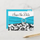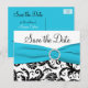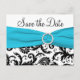 Cette carte postale "Save the Date" en damassé noir et blanc comporte un ruban imprimé bleu aqua et une broche en forme de diamant imprimée qui serait parfaite pour un mariage sur le thème aqua et noir. ****Si vous changez de police ou la taille de la police, certains éléments de la conception et/ou du texte risquent d'être coupés. Tout s'imprimera tel que vous le voyez sur votre écran. Je ne verrai pas les modifications que vous apporterez, et Zazzle ne corrigera RIEN (fautes de frappe, désalignement, etc.). Le texte est entièrement personnalisable. Si vous avez besoin d'aide avec ce produit, veuillez m'envoyer un courriel AVANT de passer votre commande. Si vous avez besoin d'autres articles assortis, veuillez envoyer votre demande à niteowlstudio@gmail.com