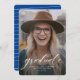 Un script classique simple "gradué" en blanc accentue une seule photo verticale de votre grade. Ce faire-part d'obtention de diplômes fonctionne pour les diplômés du collège ou du secondaire et est assez simple pour laisser briller votre photo. C'est un design intemporel et dispose également d'un dossier rayé avec une couleur personnalisable (par défaut, une nuance classique de bleu vif).