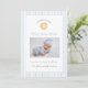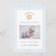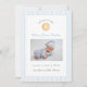 Carte de Faire-part de naissance enfant de soleil de couleur claire et simple avec photo avec bordure en bande de pin bleu et blanc.