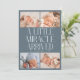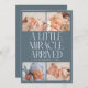 Modern Christmas theme birth announcement card featuring a bold typography text that says "a little miracle arrived" with 4 of your newborn pictures. This is a birth announcement card for the holiday seasons! Add your pictures, birth stats, and a message! The background is slate blue.