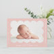 Faire-part de naissance simple et moderne avec la photo de votre bébé nichée à l'intérieur d'un cadre rose vermillon. Personnalisez le faire-part de naissance rose pâle en ajoutant le nom de votre bébé et des informations supplémentaires en lettres blanches. L'arrière de la carte présente un motif de rayures minimes blanc et roux.
