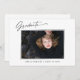 Cartes de faire-part de graduation tendance, moderne et élégant, avec éléments de design du texte moderne avec script d'encre de calligraphie. La photo du diplômé sur le devant de la carte est accentuée d'un dégradé délicat et minimaliste. Le dos de la carte offre des espaces de texte personnalisés pour des informations sur votre diplôme ou peut être effacé si vous souhaitez écrire un message à la main. Noir et blanc ou customiser facilement l'arrière - plan pour correspondre à la couleur primaire de votre école ou à n'importe quelle couleur de votre choix. Idéal pour les étudiants du secondaire, collégial et universitaire.
