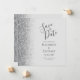 Le bord gauche de cet élégant mariage moderne, à l'exception de la carte de date, comporte une bordure en faux parties scintillant argent. Le texte personnalisable combine écriture grise fusain, cuivre et polices italiques sur un arrière - plan gris pâle. L'envers présente un design gris pâle et argenté assorti.