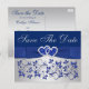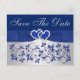 Cette carte postale romantique de couleur bleu royal et gris argenté avec motif floral et ruban imprimé ainsi qu'un nœud avec une paire de cœurs unis ornés de bijoux en diamant imprimés et de paillettes fausses (simulées) qui correspondent aux invitations de mariage présentées ci-dessous. Si vous avez besoin d'autres articles assortis, veuillez envoyer un courriel à niteowlstudio@gmail.com avec votre demande.
