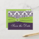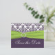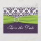 Cette carte postale de conservation de damas vert lime et violet foncé correspond à l'invitation de mariage et aux autres éléments présentés ci-dessous. Si vous avez besoin d'autres éléments assortis dans ce design, veuillez m'envoyer un courriel à niteowlstudio@gmail.com. ***VEUILLEZ NOTER que le ruban et les bijoux sont des œuvres d'art et ne sont pas réels.