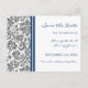 Cartes postales de mariage pour annoncer la date de votre mariage dans un élégant et contemporain gris charbon foncé, bleu marine foncé, et motif floral classique et vintage damassé blanc, stylé et entièrement personnalisable avec vos détails de mariage. Également disponible sur de nombreux autres produits pour votre cortège de mariage.