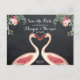Une charmante carte postale 'Save the date' sur le thème des flamants roses avec un effet de fond de tableau noir. Personnalisez le recto et le verso avec vos propres détails. Un design professionnel et unique pour épater vos invités. La papeterie de mariage assortie est également disponible.