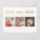 Magnifique typographie en feuille d'or faux sur le devant de cette carte postale de créateur que vous pouvez personnaliser avec 3 portraits de vos propres photos de fiançailles/mariage. Personnalisez facilement et rapidement cette carte postale de créateur imprimée de manière professionnelle pour annoncer la date de votre mariage ici et maintenant, simplement en tapant par-dessus le texte d'exemple et en ajoutant vos propres photographies. Élégante, chic, simple et classique typographie en écriture cursive/or script doré.