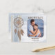 Carte postale de sauvegarde de date comportant votre propre photo de fiançailles préférée encadrée par un design de dreamcatcher en bleu poussiéreux et or rose. Au verso se trouve un modèle QR facile à lier à votre propre site web.