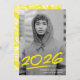 Faire-part moderne de graduation avec la photo verticale du diplômé avec "2023" en lettres manuscrites jaune vif avec un tiret ci-dessous. Personnalisez le faire-part tendance de remise de diplômes en photo en ajoutant le nom du diplômé et le nom de l'école. La classe de 2023 faire-part de graduation s'inverse pour afficher un motif de coups de pinceau jaunes et blancs.