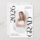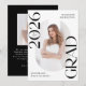 Annoncez la grande réussite du diplômé en style avec ce faire-part moderne de graduation en photo. Le design tendance présente "Class of 2025 Grad" en lettres noires en gras avec des accents de script subtils avec un arrière - plan blanc solide. La photo verticale du diplômé est affichée à l'intérieur d'un cadre oblong au centre du faire-part. Personnalisez le devant du faire-part de graduation noir et blanc avec le nom et l'école du diplômé. Le faire-part s'inverse pour afficher une photo supplémentaire affichée à l'intérieur d'un cadre de carré blanc avec le texte personnalisé ci-dessous. Le faire-part élégant de remise des diplômes est parfait pour les diplômés du secondaire et du collège.
