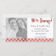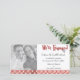 Des cœurs fantaisistes rouges et blancs bordent le bas de cette annonce de fiançailles personnalisable. Le texte indique : « Nous sommes fiancés » et une bague de fiançailles est suspendue au deuxième « g » de « fiançailles ». Texte supplémentaire personnalisable pour annoncer l'heureux événement. Téléchargez votre photo sur ce design contemporain et vous êtes prêt à partir ! Achetez en gros et économisez !