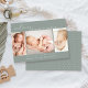 Cette simple carte de montage photo moderne est parfaite pour partager la bonne nouvelle de l'arrivée de votre bébé. Il présente un collage photo avec trois photos sur un arrière - plan vert sauge poussiéreux. Ajoutez le nom et les statistiques de naissance de votre bébé pour personnaliser la carte.