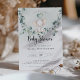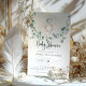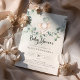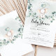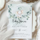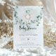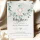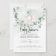 Un petit éléphant mignon sur une balançoire de branche d'eucalyptus. Cette invitation à une baby shower présente des aquarelles dessinées à la main et des polices modernes.