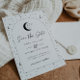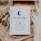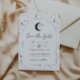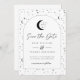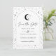 Une carte de faire-part de cérémonie à venir sur le thème de la lune et des étoiles célestes dans une palette de couleurs monochromes. Personnalisez la couleur du motif d'étoiles, du fond, du remplissage de l'arche et de l'élément de lune !