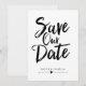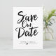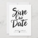Cette conception présente les mots "sauver la date" en caractères manuscrits gras noirs. Les noms des conjoints et les détails du mariage sont affichés ci-dessous et peuvent être personnalisés.