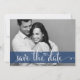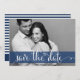 Une carte de date de réservation moderne et élégante avec une écriture calligraphique fantaisiste et des rayures bleu marine et blanches. Une carte de remerciement assortie est disponible.