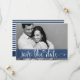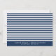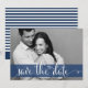 Une carte de sauvegarde de date moderne et élégante avec un script de calligraphie fantaisiste et des rayures bleues marine et blanches. Une carte de remerciement assortie est disponible.