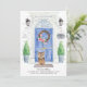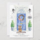 Annoncez votre nouvelle adresse avec notre faire-part élégante avec une porte d'entrée bleu Norfolk Terrier, un tapis de bienvenue, une ardoise, des topiaires et une couronne fleurie sur un arrière - plan en brique grise.