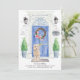 Annoncez votre nouvelle adresse avec notre faire-part élégante avec un cockapo Champagne, une porte d'entrée bleue, un tapis de bienvenue, une ardoise, des topiaires et une couronne fleurie posée sur un arrière - plan en brique grise.