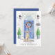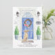 Annoncez votre nouvelle adresse avec notre faire-part élégante avec un Labrador Retriever, une porte d'entrée bleue, un tapis de bienvenue, une ardoise, des topiaires et une couronne fleurie posée sur un arrière - plan en brique grise.