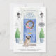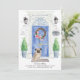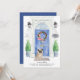 Annoncez votre nouvelle adresse grâce à notre faire-part élégante avec un Carlin, une porte d'entrée bleue, un tapis de bienvenue, une ardoise, des topiaires et une couronne fleurie posée sur un arrière - plan en brique grise.