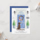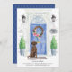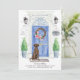 Annoncez votre nouvelle adresse avec notre faire-part élégante comprenant un récupérateur Labrador Brown, une porte d'entrée bleue, un tapis de bienvenue, une ardoise, des topiaires et une couronne fleurie posée sur un arrière - plan en brique grise.