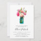 Alliant charme rustique et florales vives et lumineuses, notre faire-part de fête de fiançailles Bouquet de pivoines présente une illustration aquarelle d'un pot Mason débordant de fleurs et de tiges de pivoines rose pâle et rose vif. Personnalisez avec les détails de votre fête de fiançailles ci-dessous dans un mélange chic de typographies modernes bloc et script manuscrit.