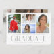 Simple Script Multi Photo Graduation Card présente quatre de vos photos préférées de votre diplôme d'études supérieures ou secondaires sur le devant avec l'élégant script moderne de calligraphie argentée "Graduate" superposition. Ajoutez une photo supplémentaire au verso. Simple, élégant et classe. Créé par ©Evco Studio www.zazzle.com/store/evcostudio