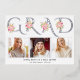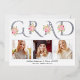 Véritable feuille d'argent GRAD typographie photo graduation faire-part. Il comporte le mot "GRAD" dans une police décorative en papier argenté, bouquets de roses roses et trois photos. Le côté arrière est muni d'un motif de casquettes blanches de graduation en gris.
