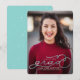 Célébrez votre diplômé avec cet élégant faire-part de graduation photo unique. Il comprend une photo à fond saigné avec un script de faux film turquoise. Le nom, l'année et le nom de l'école du diplômé sont tous modifiables.
