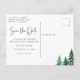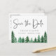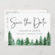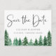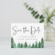 Carte de faire-part de mariage avec des arbres de la forêt verte à l'aquarelle rustique. La carte présente une calligraphie élégante "Réservez la date", sur le recto et le verso.