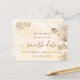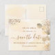 Un fond aquarelle doré orné de feuillage d'eucalyptus et de paillettes dorées. Personnalisez et ajoutez la date, le lieu et vos noms. Lettres de couleur dorée. Le texte : Save the Date est écrit avec un style de lettrage à la main tendance et grand. Dos : fond doré, conception de carte postale. Conseil : si vous ne voulez pas que cela ressemble à une carte postale, cliquez sur personnaliser, allez à l'arrière et supprimez le séparateur et le timbre-poste.