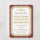 Ces faire-part de mariage présentent une palette de couleurs bordeaux, or et blanc, un cadre géométrique, des motifs géométriques et d'autres détails stylistiques inspirés de l'Art déco et des années folles. Vous pouvez personnaliser les champs de texte d'exemple à votre goût.