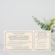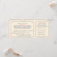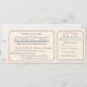 Cette invitation de mariage joliment imprimée dans le style d'un billet vintage incorpore également une carte de réponse RSVP détachable. La couleur de fond est un crème pâle. Des cadres simples aux coins arrondis de couleur bleu marine français sont rehaussés de motifs de feuilles ornementales et vintage dans un rose clair blush. Les noms de la mariée et du marié ainsi que le titre de la réponse RSVP sont également mis en valeur avec des motifs décoratifs. Au verso, l'adresse de retour peut être ajoutée à la réponse RSVP et d'autres détails sur le mariage à la partie invitation. La ligne de coupe pour la carte de réponse est indiquée au dos de l'invitation par une ligne pointillée pâle et une image de ciseaux.
