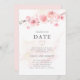 Les fleurs de cerisier rose blush les plus douces reposent sur une branche au sommet de ce faire-part de mariage moderne et minimaliste avec changement de date. Un lavis aquarelle rose à peine visible ajoute une dimension. Le verso de l'invitation est également rose blush. Le résultat est une aquarelle botanique moderne.