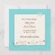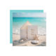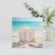 Une carte et une enveloppe vierges reposent sur une plage de sable entourée de coquillages, d'une étoile de mer et d'un arrière-plan d'océan turquoise.