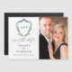 Cartes magnétiques de faire-part de mariage avec monogramme de crête feuillue et typographie écriture élégante personnalisable avec les initiales du couple.