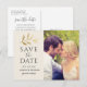 Carte de faire-part de mariage avec une photo d'engagement en portrait avec un texte élégant gris foncé / noir doux qui peut être personnalisé au recto et au verso. Une branche de couleur or accentue ce design simple inspiré de la nature. Les couleurs du fond crème / beige et du texte peuvent être modifiées pour coordonner avec votre palette de couleurs de mariage.