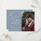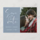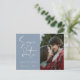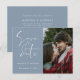 Invitez vos amis et vos proches à votre mariage avec ce faire-part de mariage moderne minimaliste sur le thème bleu poussiéreux. Il comporte une écriture calligraphiée disant « Sauver la date » et une photo de couple de mariage que vous pouvez personnaliser. Plus de détails sur votre mariage que vous pouvez écrire au dos.