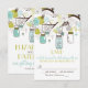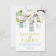 Illustrations fantaisistes de pots Mason bleus suspendus à un arbre avec des ficelles en forme de cœur, deux tourtereaux et une variété de fleurs bleues et vertes. Ce faire-part de mariage est assorti à d'autres articles. Cette invitation en pot Mason serait parfaite pour des mariages de printemps, d'hiver et en plein air.