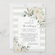 La faire-part de mariage présente un design romantique et élégant. Il présente un agencement fleuri et luxuriant avec des fleurs blanches et crème, comme des roses et des pivoines, entrecoupées de feuillage vert et de baies blanches. L'arrière - plan alterne les rayures horizontales vert clair et blanc, ajoutant une texture subtile et élégante. Le texte central est encadré dans une boîte rectangulaire blanche, bordée par les accents floraux, créant une esthétique équilibrée et sophistiquée. L'ensemble est doux, charmant et parfait pour une célébration raffinée. Facile à personnaliser avec vos informations.