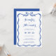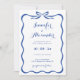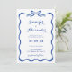 La Blue Bow Faire-part de mariage Card est un charmant mélange de fantaisie vintage et d'élégance moderne, parfait pour les couples à la recherche d'un faire-part unique et mémorable pour leur journée spéciale. Cette invitation présente une magnifique palette de couleurs bleu roi, évoquant un sentiment de sophistication royale qui prépare le terrain à une célébration mariage vraiment mémorable. Au coeur de l'invitation se trouve un cadre à ruban dessiné à la main, qui sert de point central du design. Ce détail fantaisiste mais élégant ajoute une touche de romance et de lucidité à l'invitation, capturant la joie et l'excitation de l'occasion. Le cadre de l'arc enferme les détails du mariage, attirant l'attention sur les informations essentielles avec le flair de coquette décontracté. La typographie utilisée dans toute l'invitation est soigneusement sélectionnée pour compléter l'esthétique globale. Une élégante typographie moderne est associée à un script tendance, créant un équilibre harmonieux entre les styles classique et contemporain. Cette combinaison de polices ajoute un intérêt visuel et une profondeur à la conception, tout en assurant que les détails mariages sont transmis clairement et magnifiquement. Des éléments subtils vintages et rétro sont intégrés au design, ajoutant un sentiment de nostalgie et de charme. De l'arc dessiné à la main à l'écriture fantaisiste, chaque détail de l'invitation dégage un charme intemporel à la fois élégant et unique. L'utilisation du bleu royal comme couleur principale renforce le sens de l'élégance royale de l'invitation, tout en ajoutant une touche moderne à l'esthétique globale. La teinte riche dégage un sentiment de luxe et de sophistication, ce qui en fait un choix idéal pour les couples qui veulent faire une déclaration avec leurs invitations de mariage. Cette Blue Bow Faire-part de mariage Card conviendra parfaitement aux couples qui recherchent un mélange de charme vintage et de sophistication moderne. Son design unique, ses détails fantaisistes et sa typographie élégante en font un choix exceptionnel pour un mariage qui valorise la créativité, le style et le romantisme.